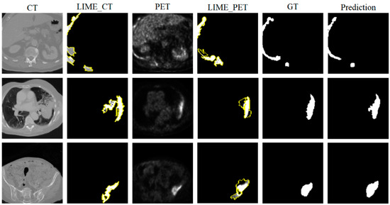 In multimodal tumor segmentation research, LIME (Local Interpretable Model-agnostic Explanations) [40] serves as an important tool for revealing the rationale behind the model’s decisions. Figure 7 presents the LIME explanation results, ground truth (GT), and predicted results of our proposed method on CT and PET images. In the LIME_CT and LIME_PET images, the white regions represent the areas the model focuses on most during prediction, while the yellow areas indicate secondary areas of attention. These color annotations allow LIME to reveal the degree to which the model relies on features in different modalities. From the figure, it is evident that, for each row of CT images, the LIME_CT explanation results show that the model mainly focuses on high-intensity edge features in the image, which are typically related to anatomical structures. The white areas cover broader edge information, and the regions highlighted by LIME show good overlap with the GT, indicating that the model is able to identify key tumor-related features in CT images effectively. For each row of PET images, the LIME_PET explanation results show that the model primarily focuses on regions of high metabolic activity (white areas), which typically correspond to tumor locations. The yellow areas highlight secondary metabolic features to which the model attends. The white areas from the LIME explanation overlap well with the tumor regions annotated in the GT, indicating that the model can accurately capture important tumor-related features in PET images as well. Moreover, the model’s predictions align closely with the GT, further validating its accuracy.