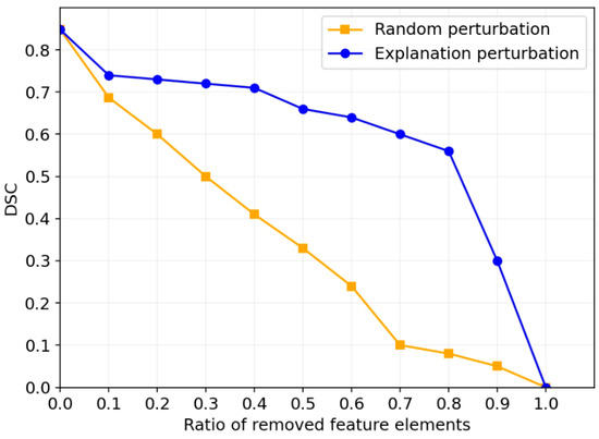 In this section, we explain the “black-box” decision-making process of neural networks through feature perturbation experiments. Specifically, the experiment involves removing certain regions from the input images and observing the impact of these removals on the model’s decisions, thus gaining a better understanding of the model’s behavior in the tumor segmentation task. We assess the impact of removing features related to the tumor regions on segmentation performance. To accomplish this, we employed two perturbation strategies: random perturbation and explanation-based perturbation. Figure 8 presents the results of the feature perturbation experiment. As shown in the figure, the explanation-based perturbation method demonstrates clear advantages over the random perturbation method. In the random perturbation experiment, as the removal ratio increases, the DSC gradually decreases, indicating that the random removal of features significantly weakens the model’s segmentation performance. Particularly, when the removal ratio approaches 1, the segmentation ability of the model is almost completely lost, with the DSC coefficient dropping close to 0, verifying the importance of features for model performance. In contrast, in the explanation-based perturbation experiment, when removing features indicated by the interpretability mask with relatively low importance, the performance degradation is significantly reduced. This phenomenon demonstrates the effectiveness of the explanation module in identifying and retaining key features. The model is able to prioritize preserving the regions of features that are crucial to the segmentation task. When the removal ratio is low (e.g., between 0 and 40%), the model maintains high segmentation accuracy, exhibiting strong robustness. This indicates that the model has minimal reliance on non-critical features and possesses a degree of fault tolerance. However, when the removal ratio exceeds 40%, the segmentation performance starts to decline significantly, especially when the removal ratio nears 1, where segmentation performance is nearly lost, indicating the model’s high dependency on these key features. This further confirms that the explanation module successfully highlights the critical features that play a decisive role in segmentation performance.