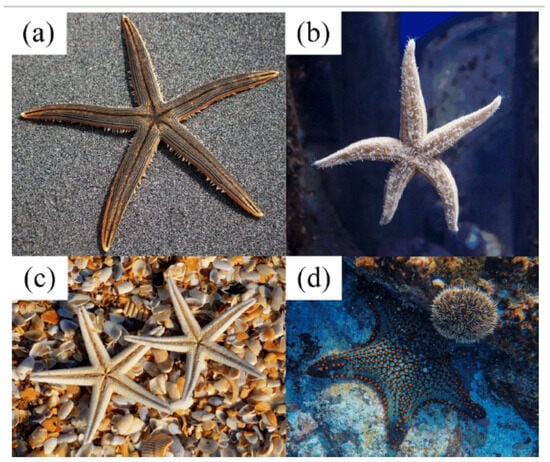 Starfish biological characteristics: (a,b) body structure, (c) reproduction behavior, and (d) prey interaction [].
