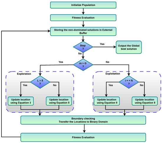 Boundary conditions are checked using Equation (10) and final updates are applied to the binary domain via a sigmoid transfer function:The final binary update is performed as []where is a random number , X represents the starfish’s location, L denotes the dimension, t is the current iteration, ¬ denotes negation, and is the transfer function. - Step 5: Computational Complexity of BMOSFO. The computational complexity of BMOSFO depends on the number of samples N, the number of features L, and the total iterations . The total complexity is formulated asThe overall complexity is composed of several components: