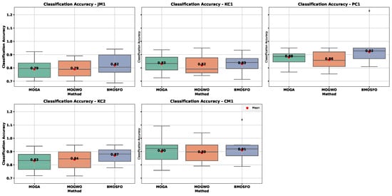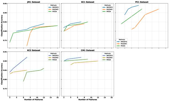 The consistent performance gains achieved through BMOSFO across all datasets validate its robustness in optimizing feature selection for defect prediction. By effectively balancing feature reduction and classification accuracy, BMOSFO not only enhances predictive performance but also improves computational efficiency. These findings demonstrate the practicality of BMOSFO in real-world software defect prediction scenarios, where high-dimensional data and class imbalance present significant challenges.