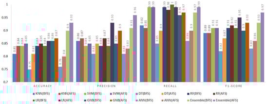 Additional advancements in ensemble learning include the use of principal component analysis (PCA) for feature selection, as demonstrated in []. A framework integrating PCA with ensemble classifiers showed that bagging achieved the highest classification accuracy of 91.49%, with feature reduction leading to an additional 0.6% increase in performance. An ensemble learning strategy combining KNN, RF, and ANNs was proposed in [], demonstrating superior performance over individual classifiers.