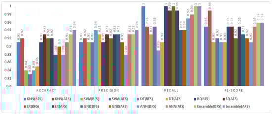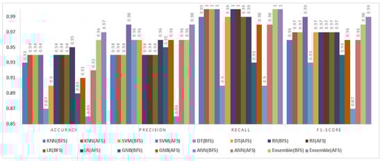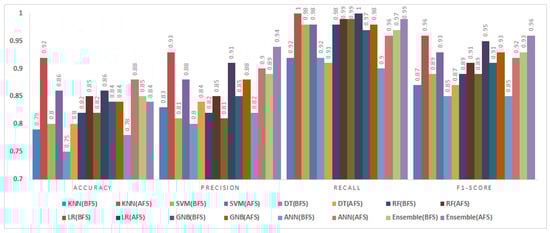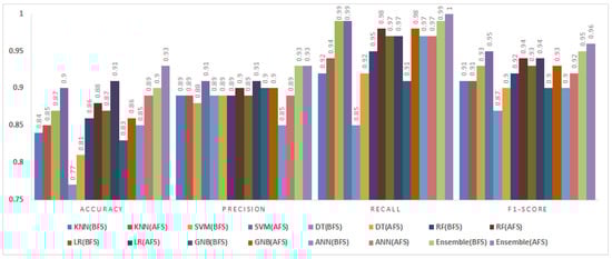 After feature selection, the KNN and ANN exhibited remarkable accuracy improvements of 13% and 10%, respectively. The fuzzy ensemble method delivered a balanced performance, achieving 5% higher precision, 2% more recall, and a 3% improvement in F1-score, albeit with 1% lower accuracy compared to the BFS results. These findings highlight the superior capability of BMOSFO in selecting the most relevant features for improved classification reliability.