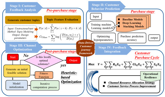 By embedding this research scheme into the three-stage customer journey framework, this study ensures that predictive modeling and heuristic optimization are not merely technical advancements but are directly aligned with strategic decision-making processes. Unlike conventional approaches that separate behavioral analysis from operational decision-making, this framework provides a unified structure that integrates NLP-driven insights with machine-learning-based forecasting and optimization modeling. This ensures that businesses can not only enhance their predictive accuracy but also develop a more interpretable and actionable decision-support system. Through this integration, the study contributes to both the theoretical and practical advancements in customer journey management, bridging the gap between data-driven analytics and strategic business implementation. The specific research framework is shown in Figure 2. Research scheme.