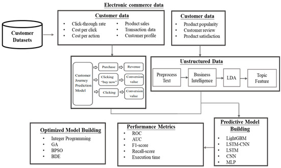 Our model evaluation, based on accuracy and mean squared error, revealed that combining LDA with neural networks boosts prediction accuracy. Splitting the data into an 80:20 training-to-testing ratio ensured robust model training and validation. Key hyperparameters, such as LightGBM’s 0.1 learning rate and CNNs’ kernel sizes, were optimized to enhance replicability and performance. The chosen models align with consumer behavior theories, where LDA uncovers latent topics related to consumer needs, and CNN-LSTM models reveal browsing patterns predictive of purchasing intent. The methodological alignment presented herein strengthens the study’s relevance to e-commerce, demonstrating a coherent, data-driven approach to customer journey optimization. Adherence to standardized Python libraries (version 3.11.11) and clearly specified version requirements ensures the replicability and reliability of the predictive insights generated across comparable datasets.