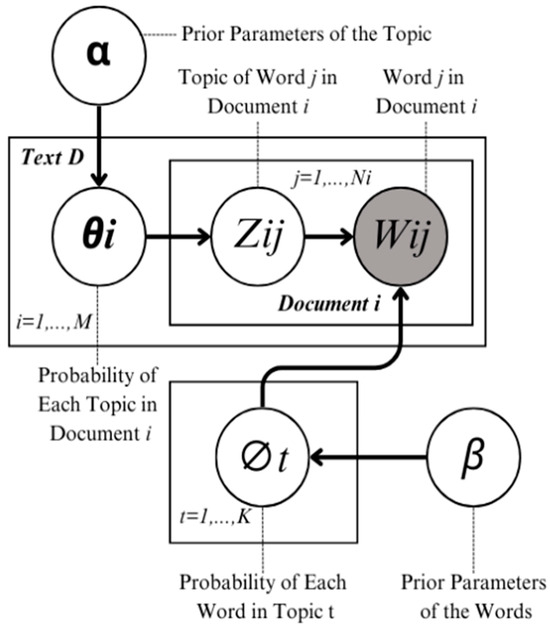 Figure 3 illustrates the LDA model framework, where topics are represented as distributions of words, and documents are mixtures of these latent themes. Here, the probabilities of words within each topic are influenced by prior parameters α and β, encapsulating customer inclinations and product attributes in the text corpus. This model framework enables the extraction of actionable themes that align with observed consumer behaviors, providing a reliable basis for predictive modeling and targeted marketing strategies. By adhering to Bayes’ theorem, LDA facilitates document categorization and allows practical applications, such as automatic theme identification, within a high-dimensional data landscape.