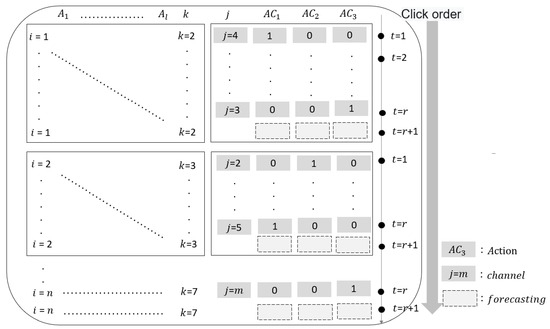Table 1 provides a structured overview of the model’s core variables, such as user IDs, channel types, click events, and conversion values, which form the foundation for evaluating each user’s engagement journey. Each interaction—quantified by specific conversion values ( for purchases and for purchase button clicks)—is linked to the financial impact and costs associated with each channel, guiding managers in pinpointing high-value interactions. Additionally, behavioral variables () and topic-specific data () capture nuanced aspects of customer preferences, enabling more personalized and targeted engagement strategies. This data framework helps marketing managers and financial analysts assess which channels offer the highest return on investment (ROI) and cost-effectiveness, informing budget allocation decisions to maximize conversion potential.