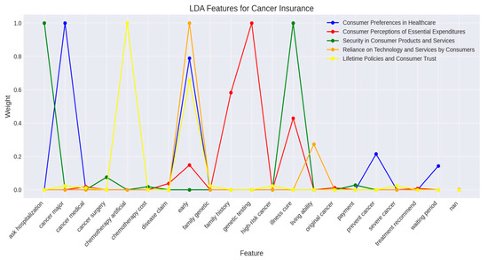 Figure 8, Figure 9, Figure 10 and Figure 11 present these LDA findings, with line graphs for each insurance type depicting the prominence of specific features. Peaks across different quadrants of the figures highlight critical attributes, offering a visual summary of customer priorities. This analysis enables insurers to strategically tailor their offerings by aligning product features with the distinct needs and preferences associated with each type of insurance.