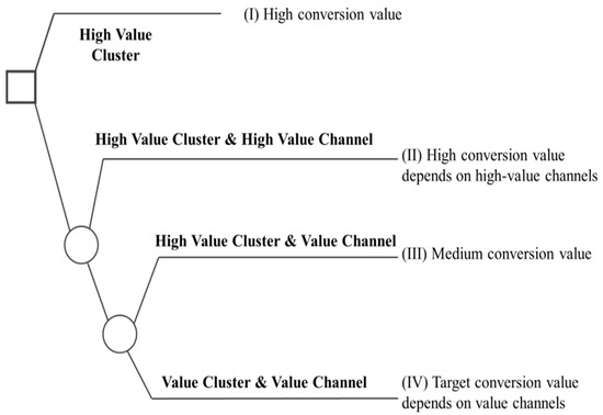 Figure 12 illustrates a strategic flowchart designed to enhance resource allocation by identifying the effectiveness of various marketing clusters and channels in converting leads into actions or sales. This flowchart categorizes channels into high, moderate, low, and undefined conversion value paths, guiding resource distribution and engagement strategies based on the observed conversion potential. High-conversion channels, depicted in the flowchart, warrant prioritized investments and intensified marketing efforts, as they have demonstrated significant ROI and engagement capabilities. Moderate-value channels, on the other hand, benefit from steady yet cost-effective engagement strategies to maintain balanced returns without overspending. Refer to Figure 12: Evaluation of conversion value and rules of resource allocation.