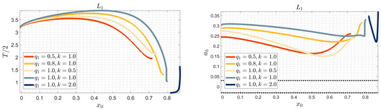Table 5 and Table 6 provide some representative initial conditions for the computed Lyapunov families corresponding to different parameter combinations. Specifically, each table presents the half-period of the orbit along with the initial position and velocity components at the first orbit’s perpendicular intersection with the Ox-axis. Note, at this intersection, the remaining components are set to zero; i.e., and . Additionally, we include the position component from which we may define the orbit’s amplitude along the Ox-axis, as well as the corresponding Jacobi constant C and the horizontal stability parameter Table 5 examines the influence of the radiation pressure factor on the infinitesimal periodic orbits while keeping the force ratio parameter fixed at . The numerical results indicate variations in stability characteristics and Jacobi constant values as the radiation pressure changes. Table 6, on the other hand, explores the effect of different values of the force ratio parameter k while maintaining a constant radiation pressure factor . The results highlight how variations in the rotational characteristics of the primary bodies affect the stability of periodic orbits. The data presented in both tables may serve as initial conditions for computing all the Lyapunov families examined in this study; therefore, they provide a valuable reference for analyzing them and assessing their stability properties across different parameter regimes.
