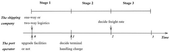 We consider a port operator (she) and a liner container shipping company (he) in the context of port upgrades. Port upgrading in this study refers to port operators introducing advanced technology to existing infrastructure to improve operational efficiency and analytical capabilities. The upgraded port can attract and induce additional business as a result, and we set the proportion of business brought about by the port upgrade as b, . To simplify the analysis, the shipping company in the model can be viewed as an aggregate of all associated shipping companies. During midterm strategic planning, the port operator needs to determine whether to upgrade the port to attract additional demand, and the shipping company needs to determine whether the logistics should be carried out one way or two ways within a single round trip; as part of their short-term tactical decision making, the port operator ought to determine her handling charge per 20-foot equivalent unit (TEU), and the shipping company has to decide on their freight rate per TEU.