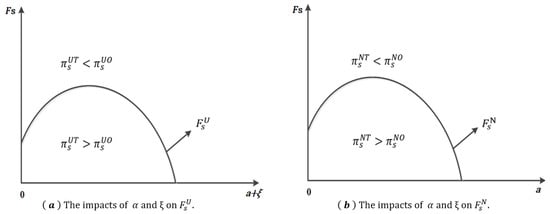 Proposition 5 states that, when the port facility is upgraded (when the port facility is not upgraded), if the associated fixed cost for the two-way logistics is sufficiently low, i.e., (), the optimal response of the shipping company is to adopt two-way logistics. Moreover, the cost thresholds and increase in b, , and . This indicates that, as the market size increases due to two-way logistics, the demand for value-added services increases, or the price of the value-added service increase, the shipping company may switch from one-way logistics to two-way logistics. As the market size expands due to the adoption of two-way logistics, shipping companies may transition from one-way to two-way logistics to capitalize on the growing market opportunities. This shift is further driven by an increasing demand for value-added services, indicating that customers seek more comprehensive and sophisticated logistics solutions. Additionally, if value-added service prices rise, companies may find optimizing their operations through two-way logistics more profitable. The effects of a and on the cost thresholds () are further discussed in Proposition 6.