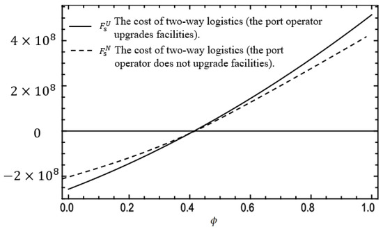 Proposition 7 suggests that, when the shipping company chooses two-way (one-way) logistics, it is better for the port operator to upgrade her facilities if the associated upgrading costs are below a certain threshold, i.e., (). Cost thresholds and increase as b, , , or a increases. This indicates that, when there is growth in the market size for shipping goods, or an increase in demand resulting from facility upgrades, or an increase in the demand for the port operator’s value-added services, or an increase in the price for the value-added services, shipping companies that have not upgraded their facilities may consider reconsidering and initiating an upgrade. Facility upgrades in response to several key market dynamics will be helpful for the port operator. Growth in the market size for shipping, increased demand stemming from facility upgrades, or an increase in the price of these services all serve as compelling reasons for the port operator to upgrade their infrastructure. Facilities upgrading can lead to improved operational efficiency, better service offerings, and the ability to capitalize on higher revenue opportunities.