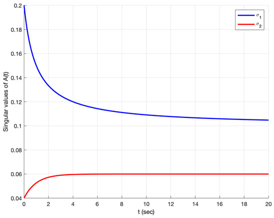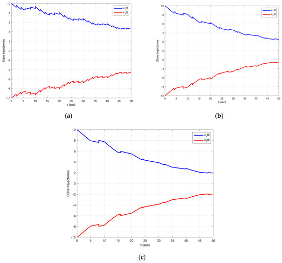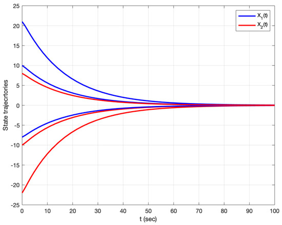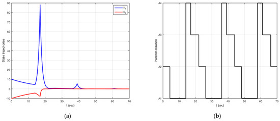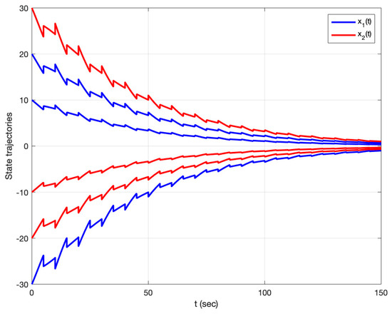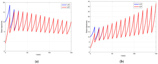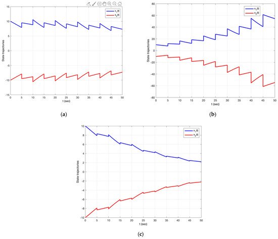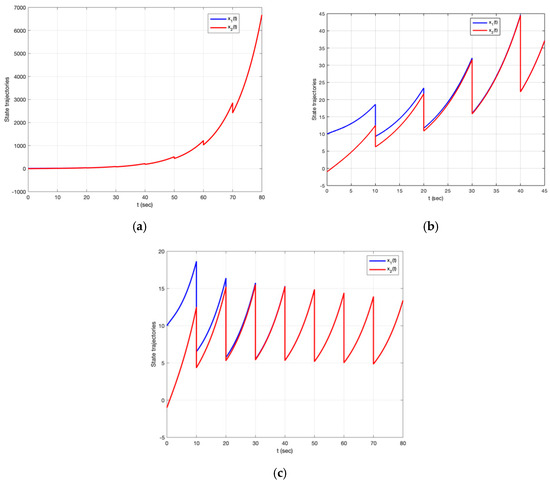 Thus, the impulsive time instants and their gains are such that (101) holds guarantee that if . Note that is the unique equilibrium point, which is the only fixed point of the mapping and defines the solution trajectory. That is, the mapping on that generates the sequence of solution of the differential system is non-expansive. Since is continuous in the disjointed union of finite intervals and is bounded if is finite, then is bounded in , which equalizes in the case of infinitely many impulses, that is, when . If , , and , then the solution can be unbounded as time tends to infinity since , and then, it is not guaranteed for a finite guaranteed that . However, the global boundedness of the solution is guaranteed if (critical stability of almost everywhere), and there is a finite number of impulses . Property (i) has been proved. Property (ii) follows since if , then ; . The self-mapping on , which constructs the solution trajectory sequence from any finite initial condition at the impulsive time instants, is then a weak contraction, which has a unique fixed point of . Then, since . Since the sequence of inter-impulsive time instants is bounded from (101), then the solution of the differential system is piecewise continuous bounded within each inter-impulsive interval and then in and as since from (100) and . □