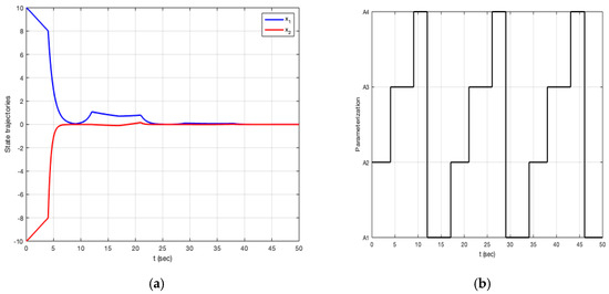 Thus, if is finite, then it follows from Theorem 5 that ; , where , , , , and . It is clear that the above property holds for and . Property (i) has been proved. Property (ii) follows directly if the number of configurations is finite by choosing after a finite time to switch to a stable configuration under the assumption that the whole impulsive set of time instants is finite. □