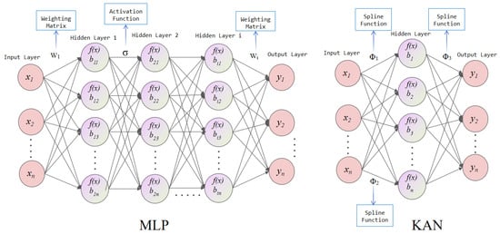 The Kolmogorov–Arnold network (KAN) is a neural network architecture based on the Kolmogorov–Arnold transcendence theorem [36]. According to the Kolmogorov–Arnold transcendence theorem, any constant function can be approximated by a weighted sum of a finite set of univariate functions [37,38]. This principle lends theoretical support to developing generalized approximate models using neural networks [39]. The KAN architecture can approximate arbitrary multidimensional functions [40]. KAN is also an optimized multilayer perceptron (MLP) for various applications. In a conventional MLP, a weight matrix connects the input layer to the hidden layer, and then an activation function is applied before linking to the output layer through another weight matrix. However, the hidden layer’s output is connected to the output layer through a spline function in KAN, and the input layer directly connects to the hidden layer. The main difference between KAN and MLP is that, in KAN, instead of providing a linear form for the nonlinear activation function, a spline approximation of the primary scalar function in each neuron is used. Adjustable parameters are fed to the scalar function values of each elementary neuron at grid points, and then a cubic spline is constructed between these grid points. Figure 2 illustrates the structural differences between the MLP and KAN network architectures.