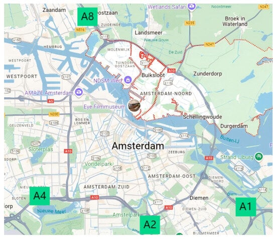 Wang et al. [48] created the Amsterdam highway dataset from data collected for four freeways in Amsterdam, the Netherlands, i.e., the A1, the A2, the A4, and the A8. The geographical coverage of the dataset is illustrated in Figure 4. The MONICA ring detectors collected the data comprising the datasets for these freeways between 20 May and 24 June 2010, resulting in five weeks of data. Summaries of the traffic flow are provided every minute. The traffic flow statistics of 1 min are combined in the same way to create a 10-min aggregation. The four datasets represent different highway types, including international highways and short interconnecting lines, etc.