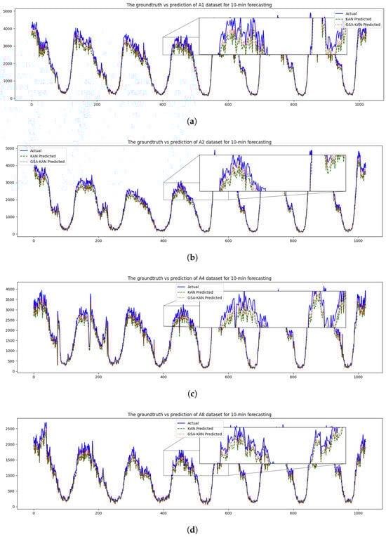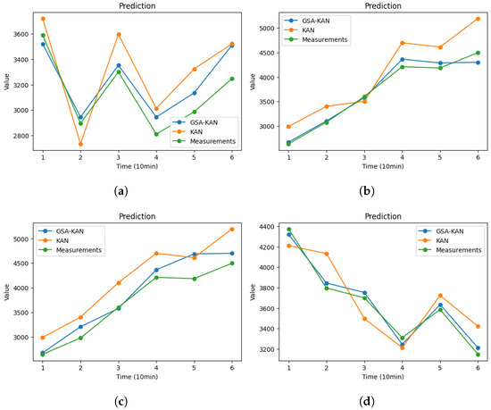 (a–d) illustrate the prediction results of KAN, as well as GSA-KAN, under conditions of fluctuating traffic flow.