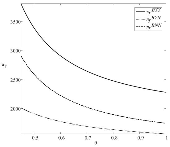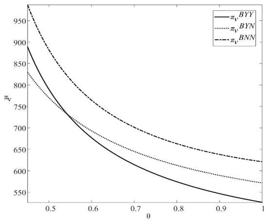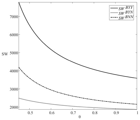 Furthermore, the price of the vehicle body plays a crucial role in influencing the battery leasing price across the four strategies. Specifically, in terms of price increases, when the vehicle body price is low (), the BYN strategy results in a higher battery leasing price. Conversely, when the vehicle body price is high (), the BNY strategy is the most effective in increasing the battery leasing price. This suggests that when the vehicle body price is low, outsourcing battery leasing to the vehicle company enables it to provide both battery-swapping vehicles and leasing services to the market. To offset the limited profit from vehicle body sales, the vehicle company may increase the battery leasing price. Conversely, when the price of the vehicle body is high, the demand for battery-swapping vehicles decreases, which directly leads to a reduction in the demand for battery leasing. As a result, when battery manufacturers operate the battery leasing service, they may be compelled to increase the battery leasing price to sustain their operations. On the other hand, with regard to price reduction, when the vehicle body price is low (), the BYY strategy is most effective in lowering the battery leasing price. Conversely, the BNN strategy is more effective in reducing the battery leasing price when the vehicle body price is high. This suggests that when the vehicle body price is low, battery manufacturers can more effectively control costs and service quality by self-operating both services (BYY strategy), allowing them to offer more competitive battery leasing prices. In contrast, when both services are fully outsourced to vehicle companies (BNN strategy), the vehicle companies’ market channels and brand influence can be leveraged to attract consumers at a lower price, thereby facilitating the wider adoption of battery leasing services.