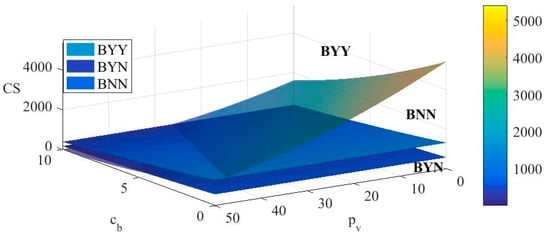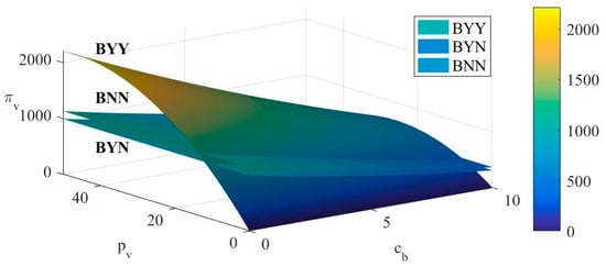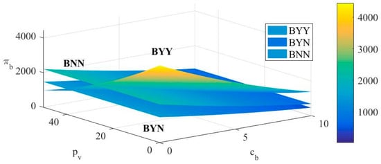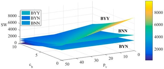 As shown in Figure 7, Figure 8, Figure 9, Figure 10 and Figure 11, the optimal strategy for enterprises, supply chain system profitability, consumer surplus and social welfare is in relation to vehicle body price. Specifically, for battery manufacturers, as well as for overall supply chain profitability, consumer surplus and social welfare, the BYY strategy is the most advantageous when the vehicle body price is low, while the BNN strategy becomes optimal when the vehicle body price is high. In contrast, for vehicle companies, the optimal strategies are reversed: the BNN strategy is preferable when the vehicle body price is low, and the BYY strategy is better when the vehicle body price is high. This indicates that when the vehicle body price is low, both battery manufacturers and vehicle companies tend to self-operate both services. However, the battery-swapping supply chain develops optimally only when battery manufacturers operate in both services. When the vehicle body price is high, neither battery manufacturers nor vehicle companies are likely to self-operate with both services. However, in this scenario, if vehicle companies manage both services, they can better facilitate the growth of the battery-swapping industry. These findings demonstrate that the strategy that maximizes the profit of battery manufacturers and the overall supply chain system may not always align with the optimal strategy for vehicle companies, potentially diminishing their willingness to collaborate with battery manufacturers.