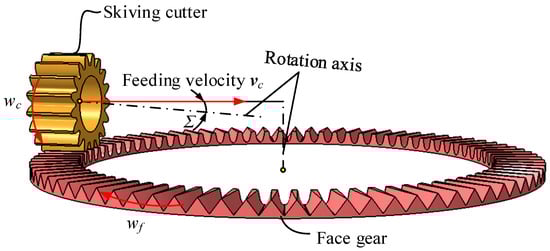 Previous studies have thoroughly examined the mechanism of spur face gear skiving. During the skiving process, the tooth profile is formed as the cutter and the workpiece operates at prescribed angular rates, as shown in Figure 2. To produce the full width of the skived gear teeth, a feed velocity vc is applied to the skiving cutter (or work piece), directed along the tooth width. Unlike gear shaping, which involves a cutting velocity aligned with the cutter’s rotational axis, skiving requires an axis-crossing angle Σ between the cutter’s axis and its feed velocity. And wc and wf denote the angular velocities of the skiving tool and the face gear. The correlation between these two angular velocities is able to be outlined in the following equation.