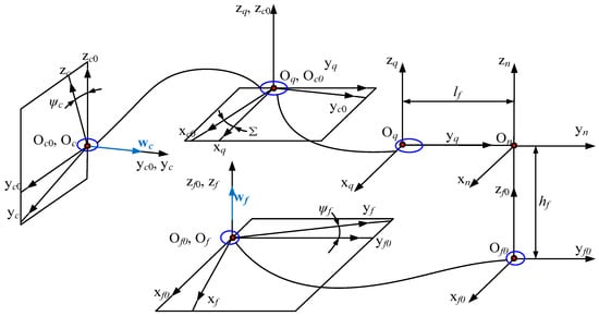 As stated by the kinematics of the face gear depicted in Figure 2, the coordinate systems are defined as depicted in Figure 3. Sf(xf, yf, zf) and Sc(xc, yc, zc) are fixed to the face gear and the skiving cutter, respectively. The initial position coordinate systems Sf0(xf0, yf0, zf0) and Sc0(xc0, yc0, zc0) represent the face gear and skiving cutter at the starting point where their rotational angles about their respective axes are zero. Additionally, Sm(xm, ym, zm) and Sn(xn, yn, zn) represent the auxiliary coordinate systems used for further reference in the kinematic analysis.