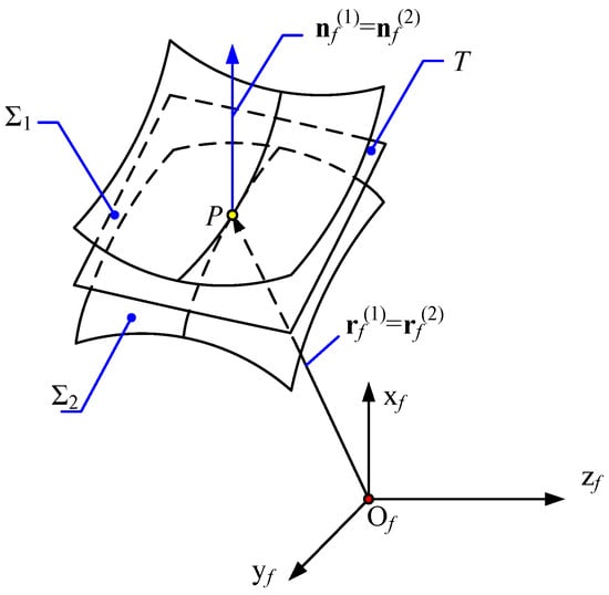 Tooth Contact Analysis (TCA) is a method used to geometrically model the meshing and interaction behavior of gear tooth surfaces. It tracks the position of contact points at every moment during operation. The primary objectives of TCA are to identify the instantaneous contact points and to ascertain the contact paths on the gear tooth surfaces. As apparent in Figure 5, Σ1 and Σ2 denote the un-deformed surfaces of the pinion and the face gear, respectively, and the instantaneous contact point P(xp, yp, zp) is defined by six equations with six unknowns as follows.