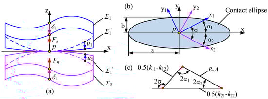 According to Hertz point contact theory, due to elastic deformation, the contact point P becomes an elliptical contact area. When a normal contact force Fn is applied, the surfaces Σ1 and Σ2 deform and shift to Σ1’ and Σ2’, respectively. Points on Σ1 and Σ2 experience normal displacements u1 and u2, as shown in Figure 6. The elastic deformations at the interact point for Σ1 and Σ2 are denoted as δ1 and δ2, and their sum δ represents the total deformation.