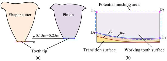 - Edge Contact Constraint: An evaluative method is employed to ascertain the occurrence of edge contact in Section 3.2.3. The outcome of this assessment dictates whether the optimization process proceeds or an alternative set of design parameters is explored. In the gear design process, avoiding edge contact is an important evaluation criterion. This is because edge contact leads to localized stress concentration, which severely reduces the reliability and durability of the gear transmission. Therefore, before calculating performance indicators such as contact stress and transmission error, it is necessary to determine whether edge contact occurs. If edge contact does not occur, it indicates that the set of parameters is suitable, and we can continue with the calculations. However, if edge contact is present, subsequent calculations would be meaningless.