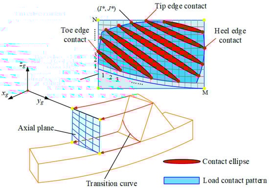 To accurately estimate the actual tooth contact situation, it is indispensable to consider the effect of load during the meshing process. Load tooth contact analysis (LTCA) developed from TCA, and further considers the elastic deformation of the two tooth surfaces at the interact point so that the interact point expands into a contact ellipse.