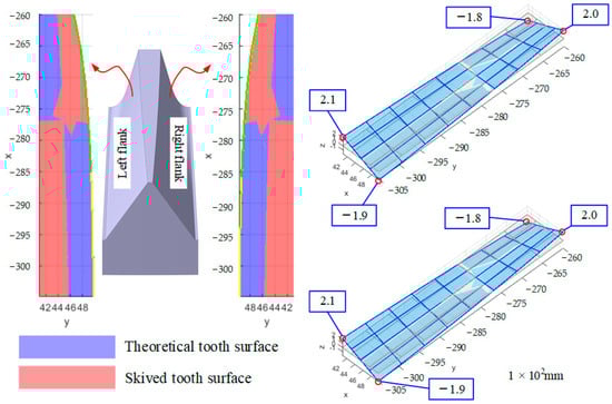 The deviation distribution trends on both the left and right tooth surfaces show similar patterns and magnitudes, as shown in Figure 10. For a single tooth surface, the error distribution exhibits both undercutting and material residuals. The maximum residual occurs at the tooth top at the outer radius with a value of 2.1 × 10−2 mm, followed by another significant point at the tooth root at the inner radius with a value of 2.0 × 10−2 mm. Conversely, the maximum undercutting is observed at the tooth root at the outer radius with a value of −1.9 × 10−2 mm, with the second significant position at the tooth top at the inner radius being −1.8 × 10−2 mm. Undercutting mainly occurs close to the tooth root at the outer radius and the tooth top at the inner radius. In contrast, residuals are mostly found near the tooth root at the inner radius and the tooth top at the outer radius. The overall error across the tooth surface manifests in a twisted hyperbolic paraboloid distribution. Based on the face gear meshing process, interference or edge contact is probable to happen close to the tooth root at the inner radius and the tooth top at the outer radius.