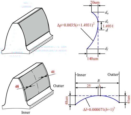 Spur gear is one of the most common gears in actual production and use. The specific modification tactic involves modifying the original tooth profile and tooth direction line, with the standard tooth surface as the basis. There are many ways to modify straight gear, such as tooth profile modification, tooth direction modification, helix modification, etc., through these modification methods, the contact stress, contact degree, and transmission error are finally improved [36]. This paper adopts a comprehensive method of tooth profile modification combined with tooth direction modification, as shown in Figure 1.