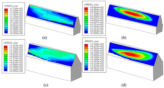 The contact patterns of the standard group and the optimized group: (a) the pinion of the standard group; (b) the pinion of the optimized group; (c) the face gear of the standard group; (d) the face gear of the optimized group.