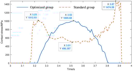 Figure 13 shows the curve of the maximum contact stress value of the face gear tooth surface in the meshing process under these two groups of conditions. The vertical axis represents the contact stress values, while the horizontal axis represents the moments of meshing. It is important to note that the meshing moments here refer solely to the progression in the finite element analysis (FEA), and are unrelated to real-time. For the standard group, the stress increases sharply to 1012.93 MPa at the time of biting, and with the meshing process, the meshing position moves to the center of the tooth surface, when the stress gradually decreases to about 496.387 MPa. Then, the stress increases again to 1474.58 MPa, and finally, the tooth is biting out. However, the stress value of the optimized group gradually increases from the beginning of the biting in, reaching a maximum of 1005.68 MPa. At this time, the meshing position is in the center of the tooth surface, and then, with the progress of the biting out, the stress gradually decreases until 0. Compared with the standard group, there is only one peak value in the stress change process of the optimization group. Although its peak value (1005.68 MPa) is larger than that of the standard group (496.387 MPa) simultaneously, it is located in the center of the tooth surface, which can better bear large loads and avoid failure easily.