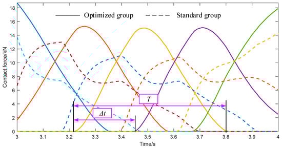 where T is the duration of engagement of a single gear tooth, and Δt is the difference between the time of engagement of two adjacent gear teeth, its specific significance is shown in Figure 14. In this figure, different colors represent different contact pairs. According to Equation (47), it can be calculated that the contact ratios of the standard group and the optimized group are 3.41 and 2.45, respectively, which indicates that the load on a single tooth in the optimized group is greater. The decrease in contact ratio is a negative consequence brought about by avoiding edge contact. In this paper, to avoid edge contact, the tooth surface of the cylindrical gear is modified by adjusting its tooth surface modification parameters, resulting in a convex shape. This modification helps prevent edge contact during the meshing and de-meshing moments. As a result, the time for a single-gear tooth to participate in meshing becomes shorter, leading to an increase in the load on a single gear tooth. This, to some extent, causes an increase in the contact stress on the tooth surface. However, considering that edge contact can bring a higher risk of gear failure, it is essential to find a reasonable balance between avoiding edge contact and controlling the tooth surface contact stress.