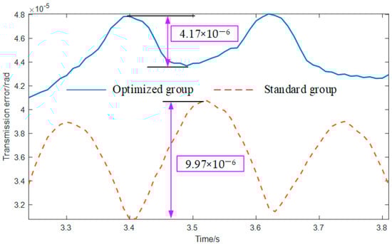 Another important meshing performance evaluation index is the size of the transfer error, and its calculation formula can be found in the reference [37], which will not be repeated here. The amplitude and shape of the transmission error represent the stationarity in the transmission process. Figure 15 shows the transmission error curve for both groups. It indicates from the figure that the transmission error curves of both the standard and optimized groups are smooth. Compared with the standard, the optimized group has a smoother transmission error curve and a smaller transmission error amplitude, so its transmission process will be more stable.