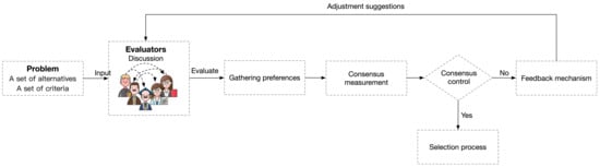 On the other hand, when the number of evaluators is large, it is difficult to ensure that the obtained solution can be agreed upon by the evaluators because of their different knowledge, experience, and backgrounds. To improve the level of acceptance degree by the whole evaluators, it is essential to conduct a CRP before the final decision is made. CRP is a dynamic and iterative process that helps evaluators modify their original opinions to bring them closer to each other, thereby increasing the agreement between them. A general CRP scheme is described in Figure 1 and consists of the following four phases: