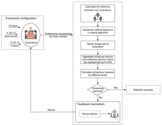 In this section, a hesitant fuzzy CRP framework for LSGDM is proposed, which mainly includes the following three phases: (i) clustering evaluators into different subgroups based on the c-means algorithm; (ii) developing a consensus measure for hesitant fuzzy information; and (iii) constructing a feedback mechanism to help evaluators modify their opinions.