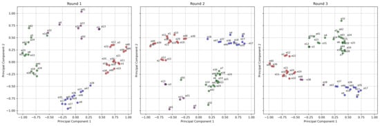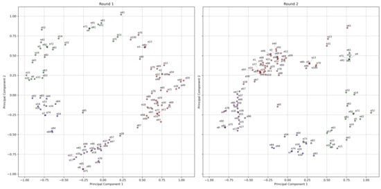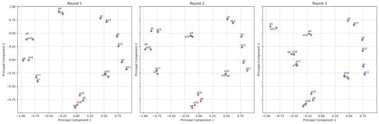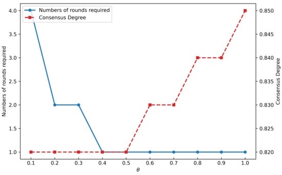 - Consensus control: The consensus level obtained in the previous phase is compared with a predetermined consensus threshold . The selection process starts if the current consensus level exceeds the consensus threshold. Otherwise, more rounds of discussion will be performed. To avoid an endless process, a maximum number of iteration rounds is also introduced ().