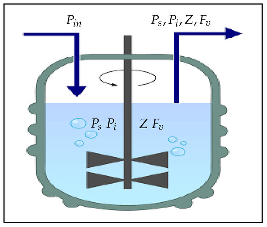 A bioreactor with a continuous stirring mechanism that continuously adds susceptible phytoplankton () and continuously removes the liquid culture () at the same flow rate (D) [36,37,38,39].
