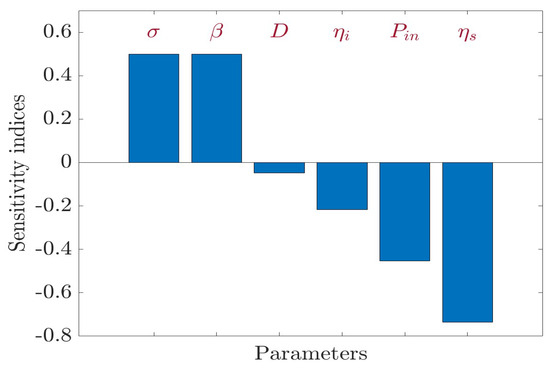 Finding and measuring the input parameters’ contribution to the model’s outcomes is the goal of sensitivity analysis [48]. A sensitivity index is typically used to quantify the sensitivity of a variable to the parameters. This enables us to ascertain the relative change in a variable after the value of a parameter is altered. Specifically, we are able to identify the parameters that most affect the fundamental reproduction number . Partial derivatives were used to determine the sensitivity indices since is a differentiable function to certain parameters [48]. We aimed to perform a sensitivity analysis for the basic reproduction number by identifying its contribution to determining the stability of the persistence equilibrium . The sensitivity indices of with respect to a parameter, p, are given by [48]
