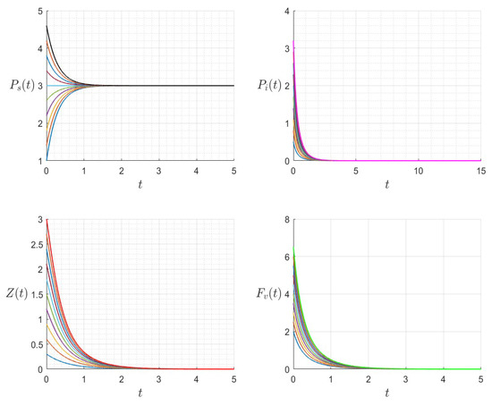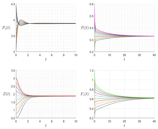 The dynamics of the variables for a range of initial values for , , , , , , and , with . The various initial conditions are shown by the various colors.