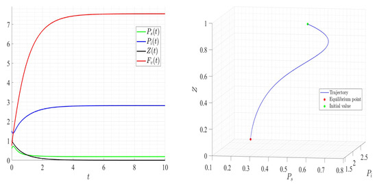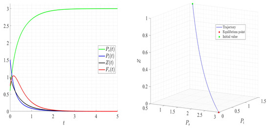 Dynamics of model (1); the components’ behavior (left) and the comportment (right) for , , , , , , and , with . The green dot (right) is the initial condition, and the red dot (right) is the equilibrium point in the space .