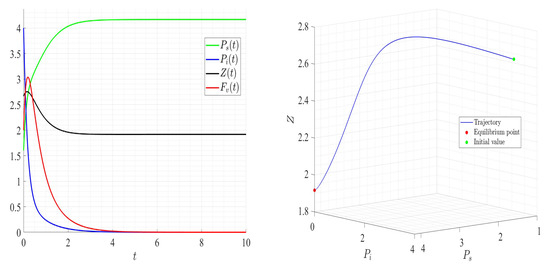 Dynamics of model (1); the components’ behavior (left) and the comportment (right) for , , , , , , and , with . The green dot (right) is the initial condition, and the red dot (right) is the steady state in the space .