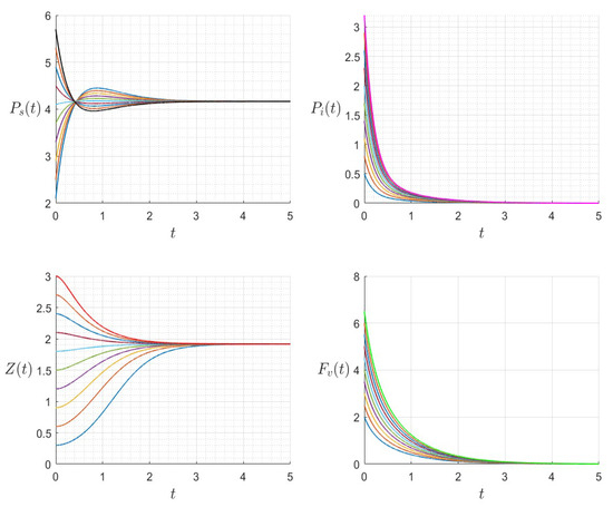 - If , then we havewith . We obtain two cases: The first case corresponds to the free viruses satisfying , , , and thus . The disease-free equilibrium point is given by . The second case satisfies . Therefore, , , and . We obtain the endemic equilibrium point that is given by . We aim to define the basic reproduction number again. Both the non-singular matrix V and the nonnegative matrix F are provided by and . Therefore, . The spectral radius of (1) is the spectral radius of the next generation matrix FV−1, expressed as follows:Note that in a population where all phytoplankton are vulnerable to infection in the presence of zooplankton, the basic reproduction number, or , is the anticipated number of instances directly caused by one infected phytoplankton.Let be the Jacobian matrix at .The characteristic polynomial of is given byNote that . Therefore, if , then exists, and its Jacobian, , admits three negative eigenvalues (according to Assumptions A1–A2) and one positive eigenvalue, and thus is an unstable equilibrium point. is a stable equilibrium point only if .Let us discuss the existence and stability of the endemic equilibrium point . Note that means that . Furthermore, we have and . Therefore, if , then , and thus exists. Let be the Jacobian matrix at , which is given byThe characteristic polynomial of is given bywhere ,, , and . In order to use the Routh–Hurwitz criteria, one must see that and deduce that because . The calculation of the two other conditions was too large, so we used Maple 12 software to verify that and , and thus we obtained the local stability of the equilibrium point once it exists ().
