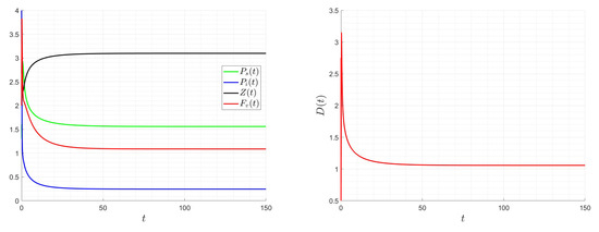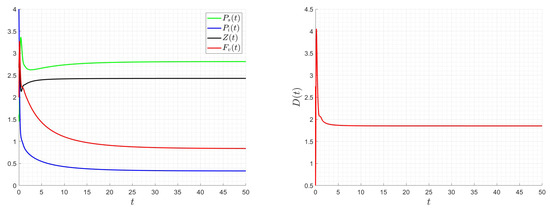 The 4D dynamics solutions (1) converged in the direction of . It was sufficient to limit the study of the dynamics (1) to the set as our objective was to examine the asymptotic behavior of these solutions. This was because, according to Thieme’s findings [44], the trajectories’ asymptotic behavior would provide insight into the full dynamics (1). When restricted to , the system (1) becomes