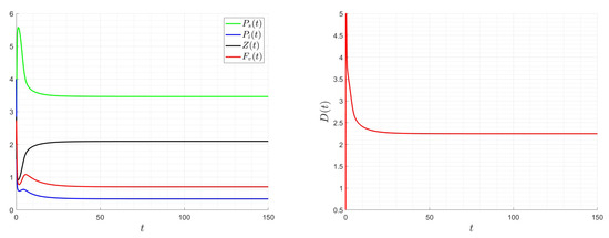 We provide several numerical examples to support the results achieved. Using MATLAB R2024a software, the Runge–Kutta–Fehlberg method was the numerical approach used to solve the model (ode45). The parameter values used in all numerical simulations were selected arbitrarily for each case.