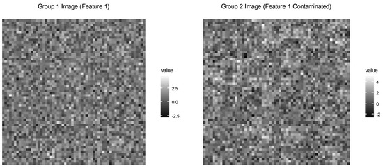 In Figure A1, the control images are generated in the same way as the first scenario to generate Figure 3A, whereas the case images are generated with the variance of 2 and the data contamination is applied. In Figure A2, the control and case images are generated as in the first scenario, then spatial correlation is added. The spatial correlation is generated over a 60 × 60 grid covering the unit square domain , using R package ‘fields’ [28]. An exponential covariance function with a short-range parameter of 0.05 is used to induce weak spatial dependence. The resulting Gaussian random fields are scaled by a factor of 0.5 to further reduce the magnitude of background variation relative to contamination signal. As a result, the simulated Gaussian fields have an approximate mean of 0 and a variance of 0.25.
