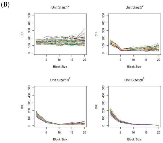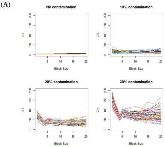 The changes in the CHI values resulting from varying levels of data aggregations are displayed in Figure 3A, based on 100 simulations for each plot. Figure 3A displays the CHI value changes across different contamination rates, with the fixed contamination unit size of . When there is no difference in distributions between the control and case images (i.e., in the absence of contamination), the CHI values remain relatively low with no notable patterns observed. When contaminated blocks are present in the case images, the figure clearly shows a distinctive pattern, where the CHI values substantially increase during data splitting (moving from right to left on the x-axis in Figure 3A). Clear elbows appear at 4 on the x-axis, even with relatively low contamination rates (e.g., 10%). When the level of contamination is higher, the overall patterns remain similar, except that the elbow points become more pronounced.
