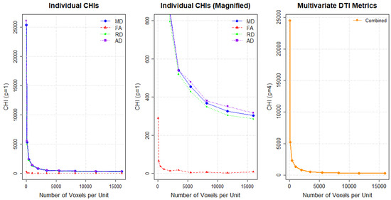 A data frame containing voxel positions (transverse: -axis, anteroposterior: -axis, and superior–inferior directions: -axis) and their corresponding metric values is created. The cleaned matrix forms the basis for the CHI calculation comparing the old and young groups (. The data are combined by aggregating voxels into larger cubes. For each aggregation level, DTI metric values are averaged, and the CHI is recalculated, assessing the impact on the CHI values at different levels of aggregation. Visualization of the results by plotting the CHI values for respective metrics against aggregation levels is discussed in Section 4.4.